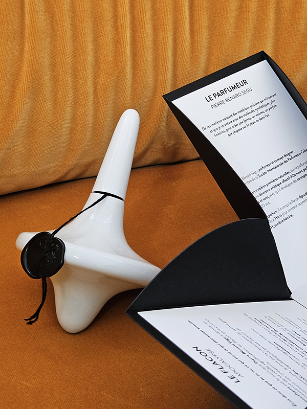 L’écrin est exposé devant les caméra du salon du Pitti Fragranze 2024 le samedi 14 septembre 2024 sur le stand du distributeur italien Abaton.